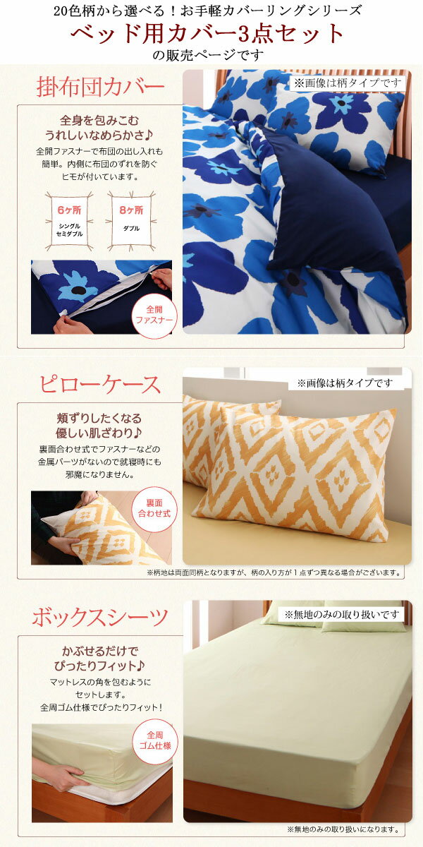 ) -サイズ- (ベッド用3点セット/ダブルサイズ) 掛け布団カバー:190×210cm ボックスシーツ:140×200cm+厚みマチ25cm 枕カバー:43×63cm -材質- 側地:ポリエステル100% -仕様- 掛け布団カバー×1、ボックスシーツ×1、枕カバー×2の4点セット 着脱方式:掛け布団カバー/全開ファスナー式、ボックスシーツ/全周ゴム仕様、枕カバー/裏面合わせ式 掛け布団カバー内ズレ防止ヒモ付き 洗濯機洗い可(品質表示をご確認下さい) -配送- 玄関先お届け -お届けの目安- 2営業日後出荷/3-4日後お届け ※土日祝日は定休日 -配達日時指定- 指定可 -追加送料が必要な地域- 沖縄県全域/離島(金額は事前にお問い合わせください)サイズバリエーション ベッド用カバー3点セット(柄タイプ) シングル セミダブル ダブル ベッド用カバー3点セット(無地タイプ) シングル セミダブル ダブル その他のカバーリングシリーズはこちら 和式用3点セット 掛け布団カバー ボックスシーツ 敷き布団カバー 枕カバー ≪こちらもオススメ!人気寝具シリーズはこちら≫